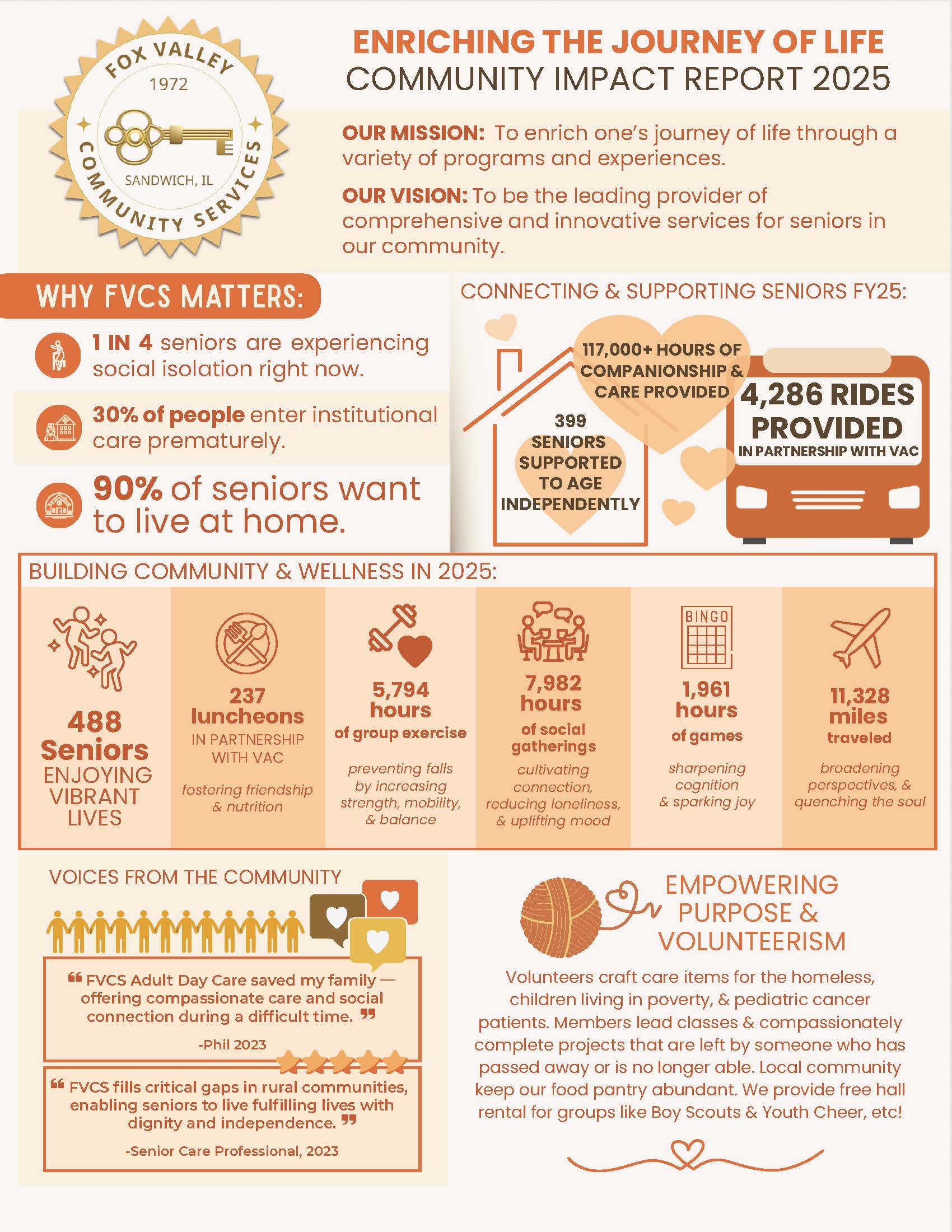 Fox Valley Community Services aims to help seniors age positively and creatively through providing a variety of programs and services. Our goal is to improve and enrich vital independent living, enhance dignity and self-respect, and encourage participation in community life.